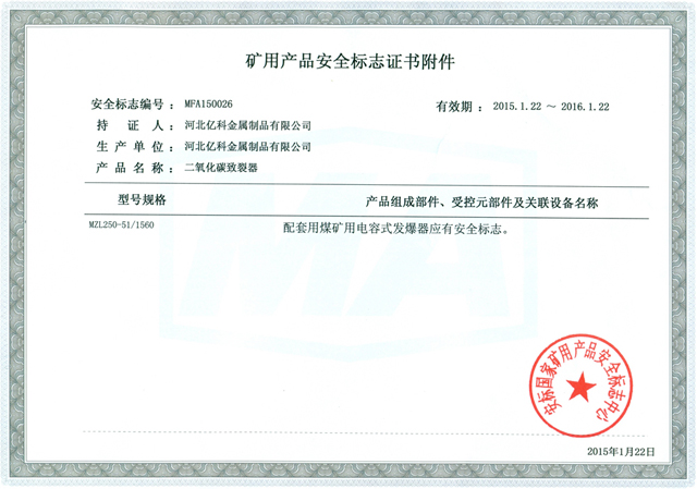 河北億科金屬制品有限公司自主研發(fā)出MZL系列二氧化碳致裂器及充灌、檢測、連接與起爆等配套裝備,可提供二氧化碳致裂技術(shù)與成套致裂裝備,能滿足100MPa~250MPa不同爆破壓力和各種工況條件下的應(yīng)用。